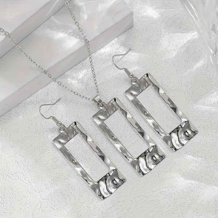 Necklace: It consists of a thin chain, and the pendant is a rectangular metal frame with a hammered effect on the surface.