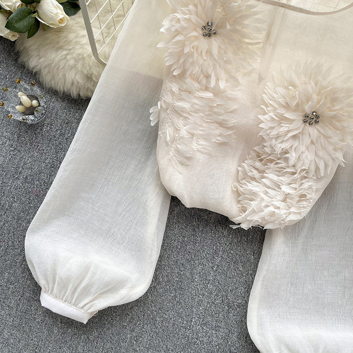 This exquisite pullover top features delicate 3D floral embellishments that create a romantic, artistic statement. The subtle see-through fabric adds a touch of sophistication while maintaining versatility for various styling options. Perfect for spring and summer occasions, this blouse combines delicate craftsmanship with contemporary fashion.