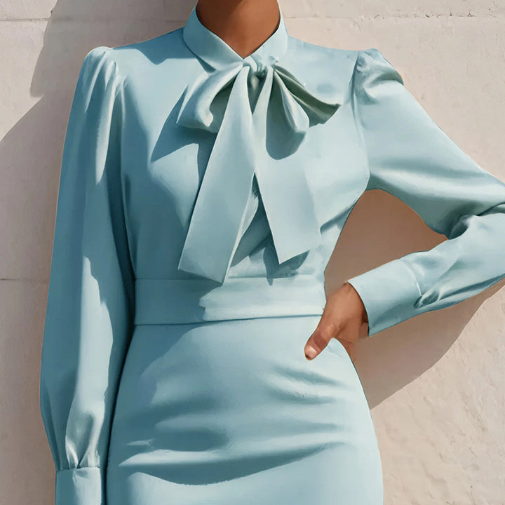 This exquisite dress features a structured stand collar that frames the neckline elegantly, complemented by artful pleating and a delicate bow detail that adds feminine grace. The strategic hem slit offers a modern touch while maintaining professionalism, and the tailored silhouette skims the body flatteringly. Crafted from 100% high-quality polyester , this dress provides exceptional drape and wrinkle resistance, ensuring impeccable appearance throughout your day. The long sleeves and knee-length design create polished elegance perfect for formal occasions. The hidden back zipper delivers seamless closure while preserving clean lines. Available in sizes S-XXL to ensure perfect fit for various body types.
